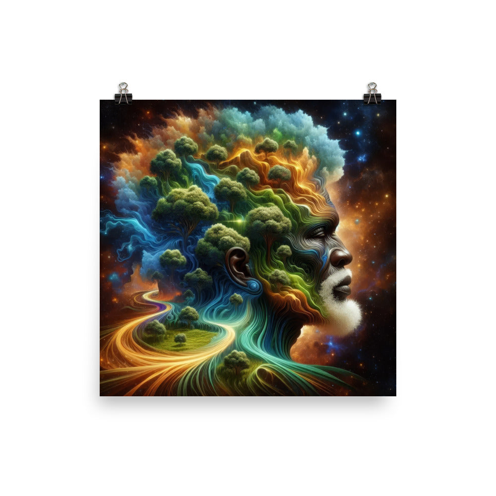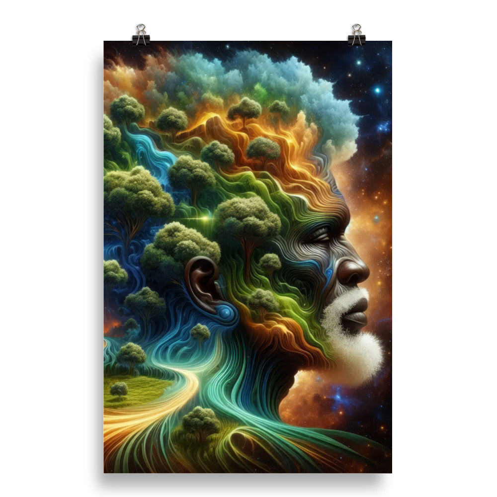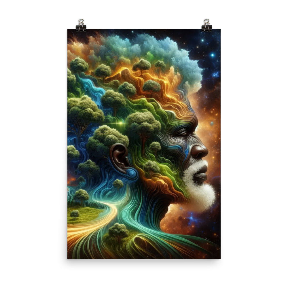 Afrofuturism Cosmic Design: A mesmerizing blend of earth tones and cosmic color—greens, purples, blues, and gold—forming a visionary portrait that reflects both the depth of the planet and the vastness of the universe.